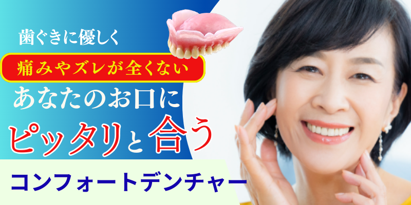 「コンフォートデンチャー」は、生体用シリコンを用いて作られる入れ歯です。入れ歯と歯茎が触れる部分に、ソフトで吸着性に優れたシリコンを使用しています。歯茎と接する面全体が柔らかいシリコンのクッションで覆われるため、歯茎への圧力がやわらぎ、噛んだときの痛みも軽減されます。