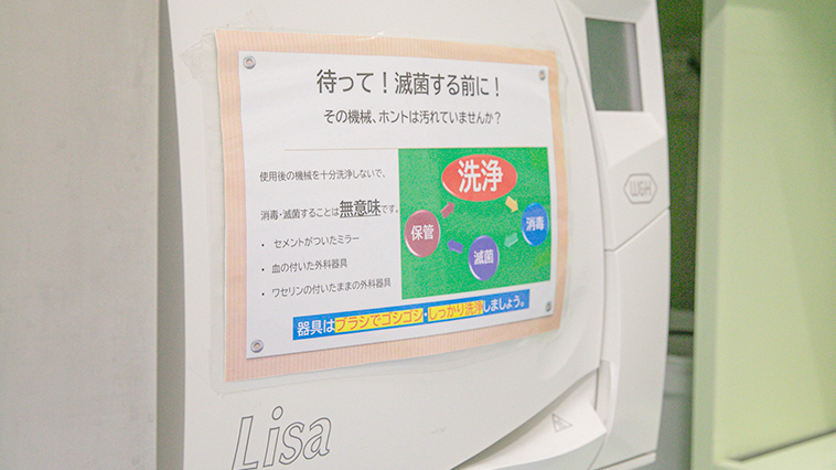 院内感染のリスクを低減するために用いる、歯を削る機械(タービンやハンドピース)専用の滅菌器です。患者さまごとに滅菌された状態の器具を使用します。